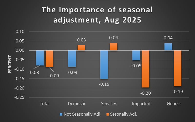 To see the importance of this, in August the unadjusted data showed a 0.1% monthly decline in prices, driven by weaker domestic and services prices. However, the adjusted data tell a different story: the fall was mainly due to declining prices of imports and goods. Without seasonal adjustment, it is easy to misread what is driving short-term changes.