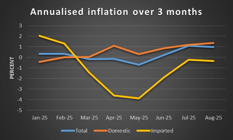 The first chart below shows total inflation alongside domestic and imported inflation, calculated over a three-month horizon and annualised. Inflation has hovered around 1% over the last two months. The dip to 0.7% in May reflected import prices falling at an annual rate of -1.9%, but that decline has now moderated to -0.3% in August.