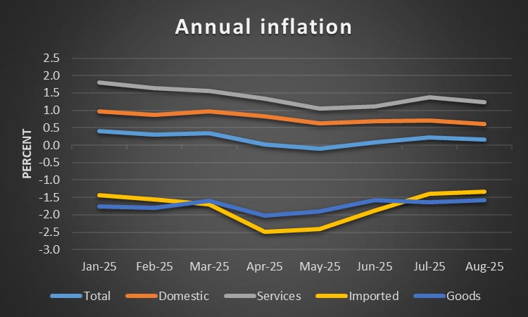 Domestic inflation edged down slightly to 0.6% in August from 0.7% in July. Services inflation declined to 1.2% from 1.4%. While this might suggest softer underlying pressures, import price inflation became slightly less negative, rising to -1.3% from -1.4%, and goods price inflation remained unchanged at -1.6%.