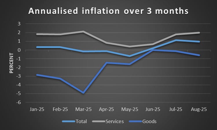 The second chart shows headline inflation together with the goods and services components. It reveals that the spring slowdown of total inflation was driven by falling goods prices. Goods price inflation also declined sharply in July and August, while services inflation, which has a much larger weight in the CPI, has risen steadily since May and is now running at an annual rate of 2%.