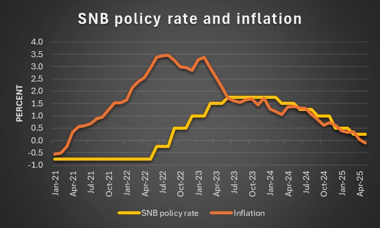 Punchline: Swiss inflation has turned negative. After hitting 0.0% in April, it fell to ‑0.10% in May. A combination of global disinflationary forces and the turmoil triggered by the recent US trade policy announcements has strengthened the franc and led energy prices to fall. What should the SNB do? In my view, a return to negative interest rates would be premature and disproportionate. Inflation is low, but the case for urgent action is weak.